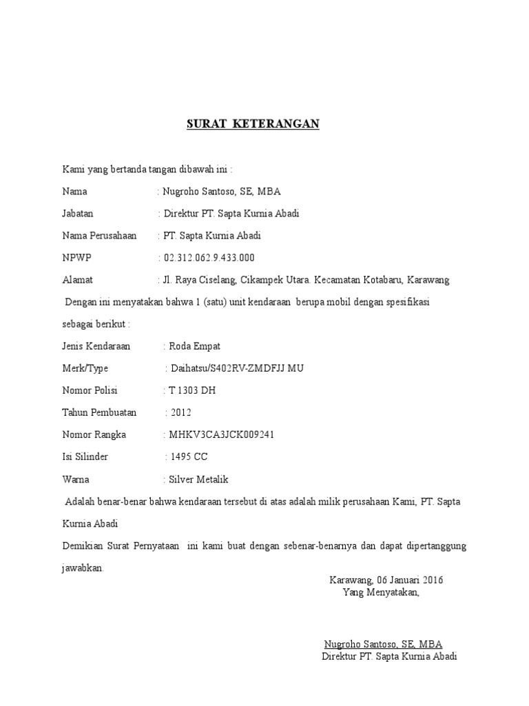 Bpkb atau bukti kepemilikan kendaraan bermotor merupakan salah satu dokumen penting yang harus dimiliki oleh semua pemilik kendaraan bermotor. Contohnya dalam faktor perpanjangan stnk kendaraan bermotor, apabila kendaraan kami adalah. Savesave surat keterangan kepemilikan kendaraan bermotor for later. Urus sendiri mutasi dan balik nama kendaraan bermotor. Home contoh surat contoh surat kuasa untuk kendaraan bermotor contoh surat kuasa untuk kendaraan bermotor.